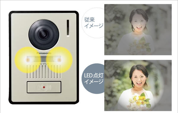 夜間、玄関子機の「呼出ボタン」が押されると、LEDライトが自動で点灯し来訪者の顔を約50㎝先までカラーで確認可能。
