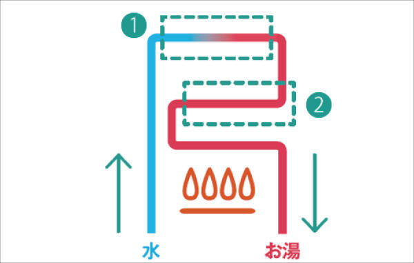 燃焼する際に200℃に近い排気ガスを排出しています。二次熱交換器で、その熱を給水に伝え「回収」することで高効率を実現しています。①給水された水は二次熱交換器を通り、排気の熱であたためられ、②一次熱交換器でさらに加熱。