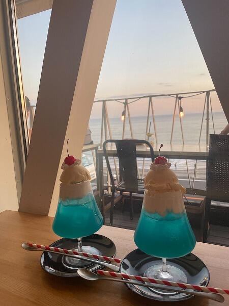 最後はこちらのカフェでクリームソーダを!海を眺めながら食事が楽しめるテラス席もあります!