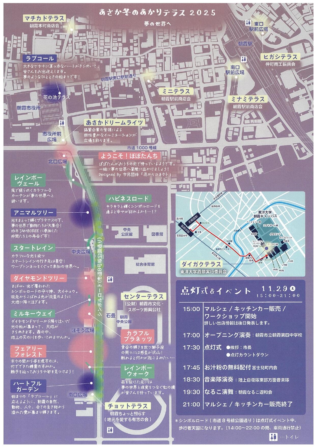 シンボルロード、朝霞中央公園石畳、朝霞駅東口及び南口駅前広場、本町まちかど広場、ASAKA B.B.SQUARE、東洋大学朝霞キャンパス5号館前