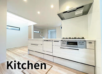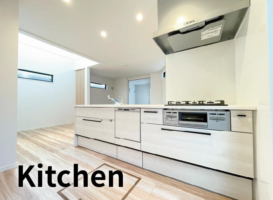 食洗機・浄水器付水栓付きのシステムキッチン。人工大理石のカウンターは油汚れがつきにくく、サッとひと拭きで綺麗を保ちます。 -