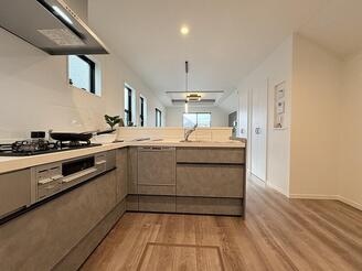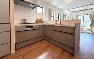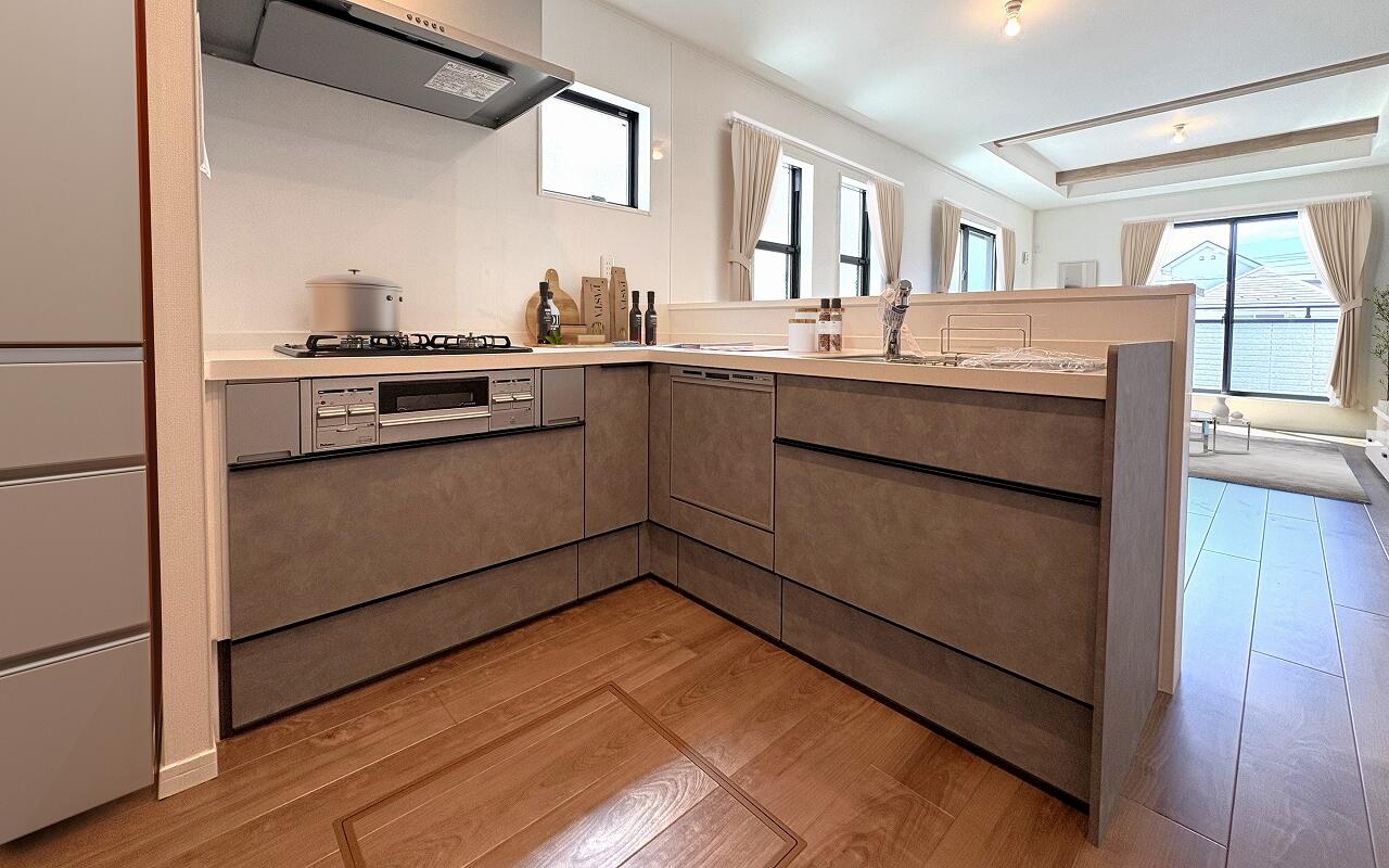 浄水器一体型水栓付きのシステムキッチン。毎日の家事をサポートし、負担を軽減する便利な食洗機付きです。 -