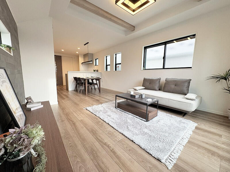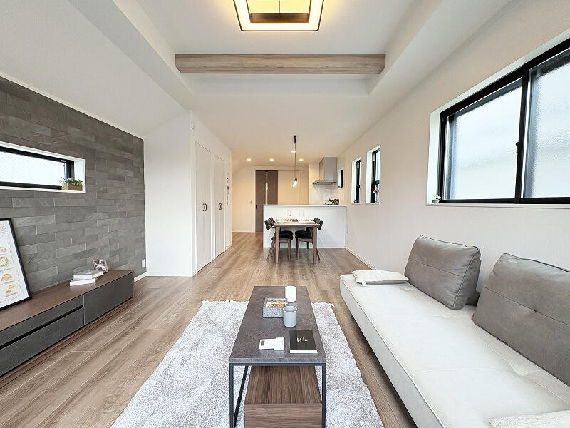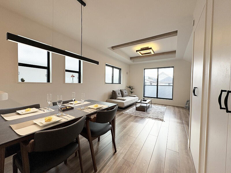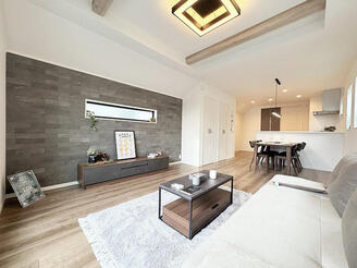 陽当たり良く開放的な18.4帖のLDKです。アクセントクロスや折上天井を採用しお洒落かつ開放感溢れる空間に仕上がっております。