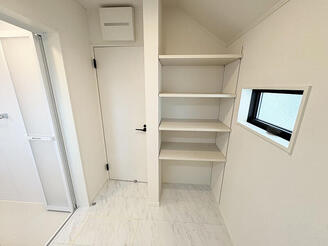 タオルや着替え、洗剤ストックの収納に便利な可動棚も設置されています。 -