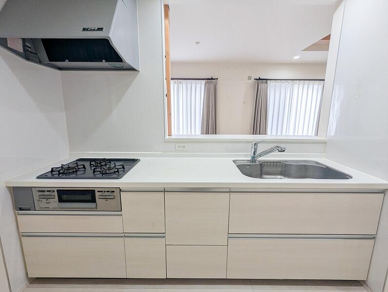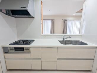 キッチンで作業しつつ、ご家族との会話を楽しめる対面式キッチン。収納豊富なので調理道具もスッキリと片付きます。 -