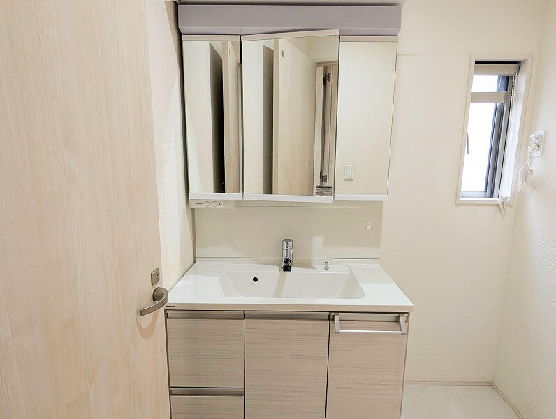 洗面台には大きく見やすい三面鏡が付いているので、身支度がスムーズに行えます。 -