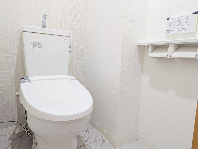 シンプルで使いやすいトイレ、二連ホルダー付き。 -