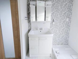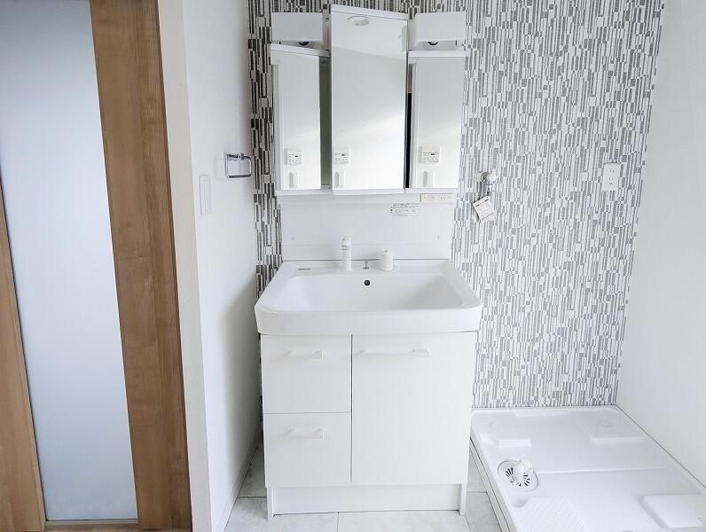 面鏡仕様の洗面化粧台を採用。機能性とデザイン性を両立。 -