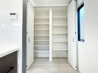 ペットボトル飲料や食品、日用品のストックまでたっぷりの収納力を備えたパントリー