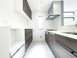 キッチン背部に同色の吊戸棚&カップボード付