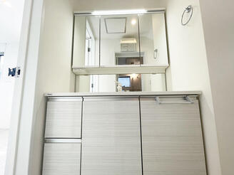 広々ワイド型で使いやすさとお手入れしやすさを兼ね備えた三面鏡付洗面化粧台(Panasonic製)