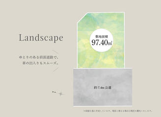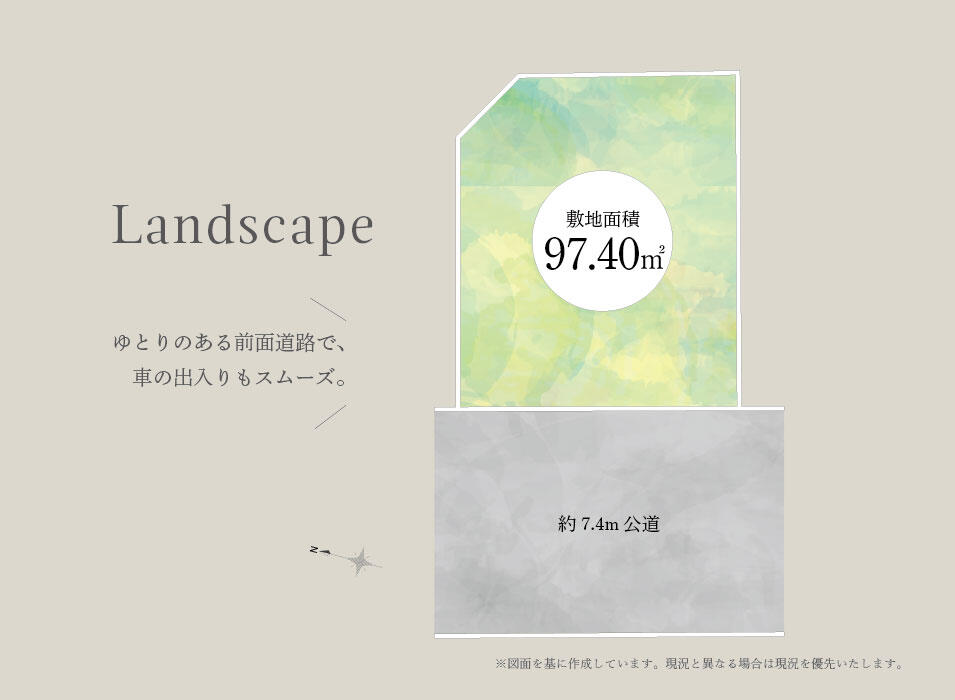 ゆとりある7.4m公道に面し、明るく開放的な立地。