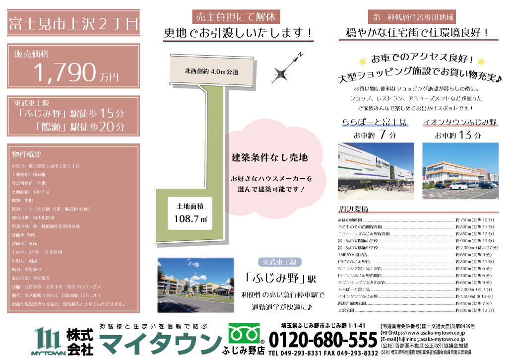 | 物件名 | 富士見市上沢2丁目 建築条件なし売地 |
