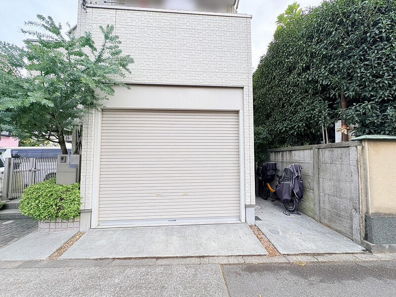 大きい車も停められる広々としたビルトインガレージ(幅:約3.0m・奥行き:約5.5m)。電動シャッター付きなので夜間や留守の間も安心です。
