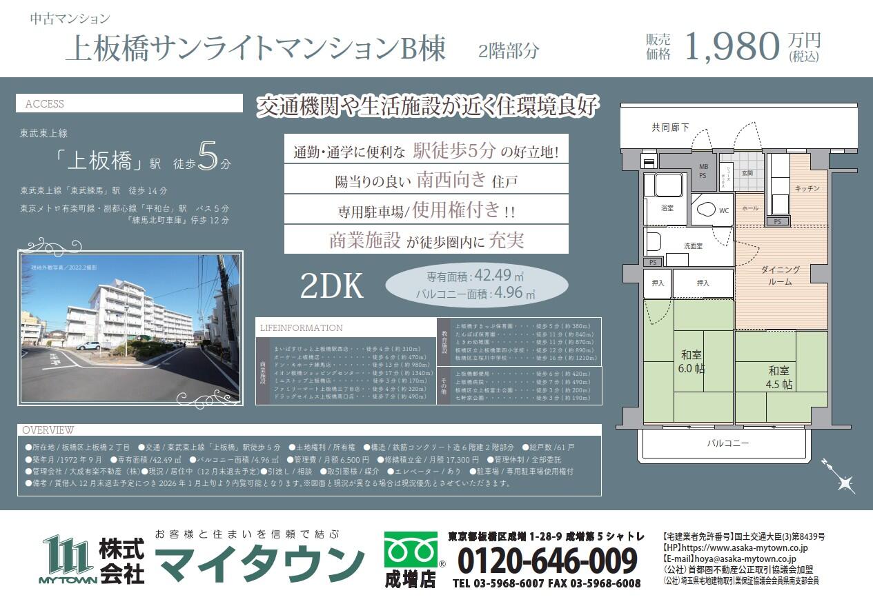 | 交通 | 東武東上線「上板橋」駅 徒歩5分 東武東上線「東武練馬」駅 徒歩14分 東京メトロ有楽町線・副都心線「平和台」駅 バス5分「練馬北町車庫」停歩12分 |