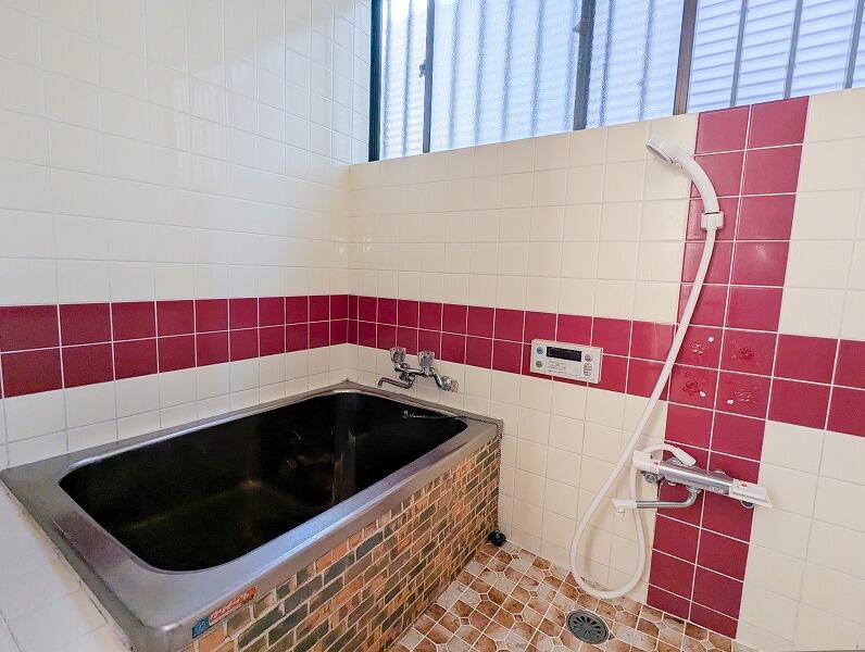 タイルで彩られた明るい雰囲気の浴室です。 -