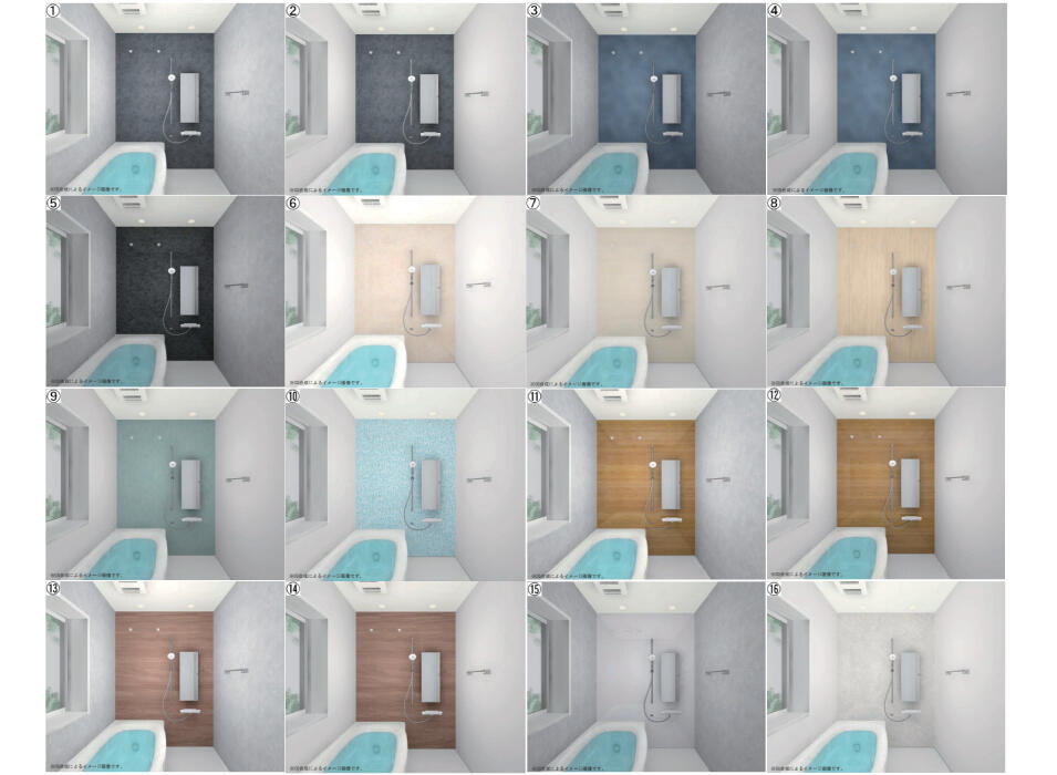 バスルームのベースパネル・アクセントパネルの組み合わせは16種類からお選びいただけます。 -
