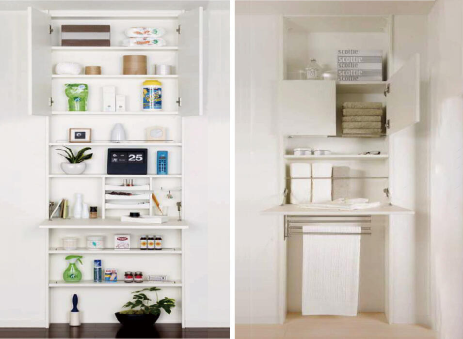 空間を最大限に活用。リビングまたはパウダールームの壁に、埋め込み収納を設置できます。