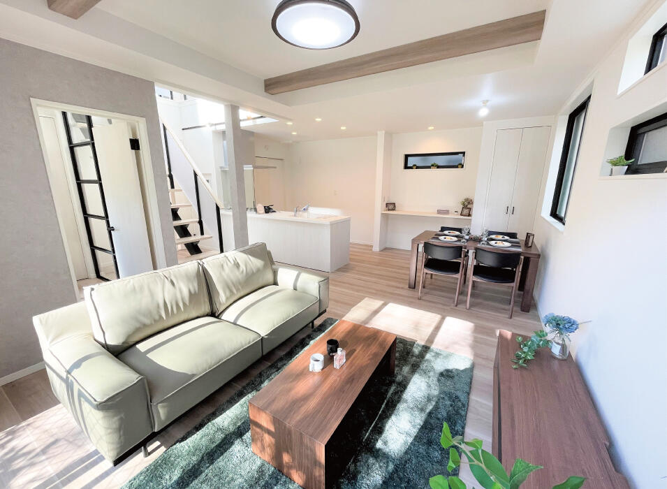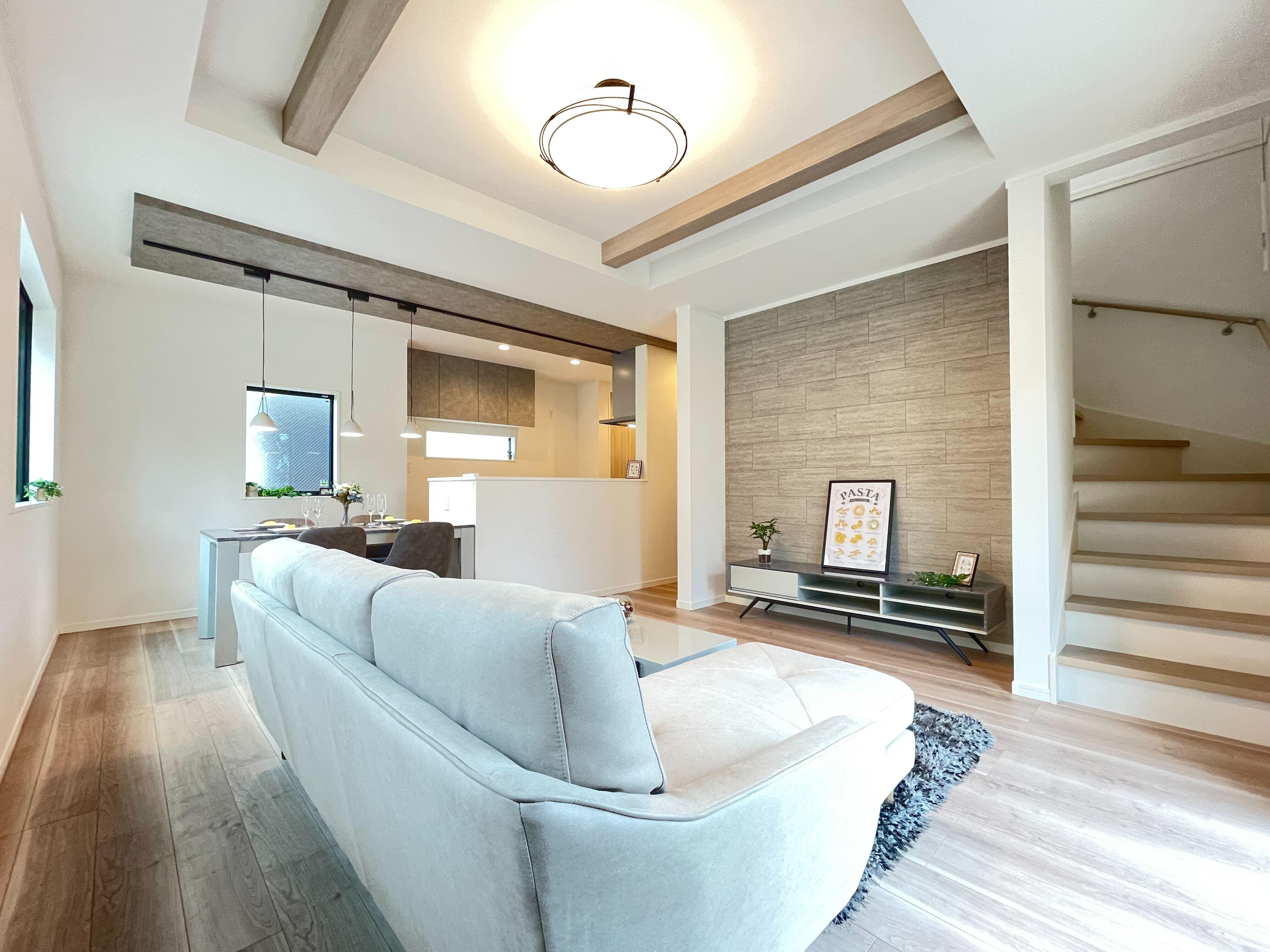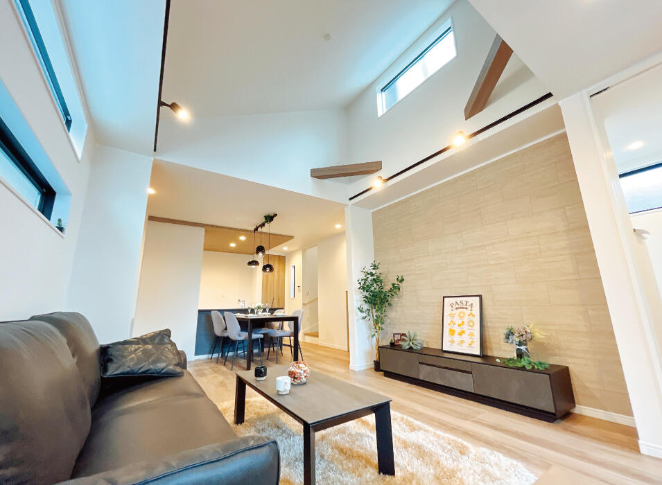 吹き抜けや折り上げ天井で空間を広く見せ開放感のあるリビングや便利なリビング収納など理想を叶えるフリープラン