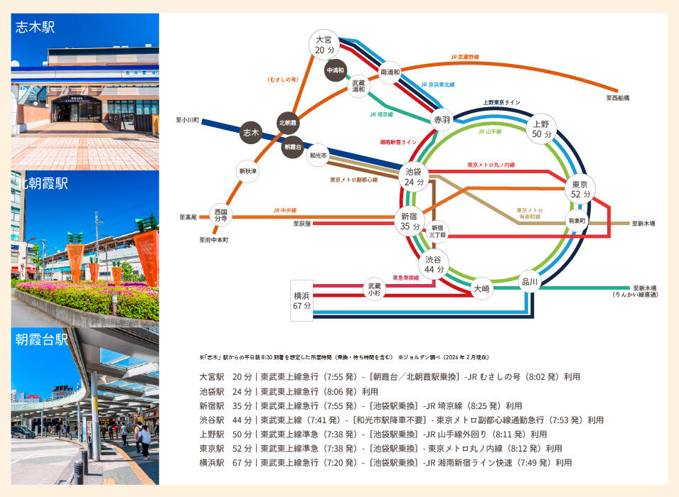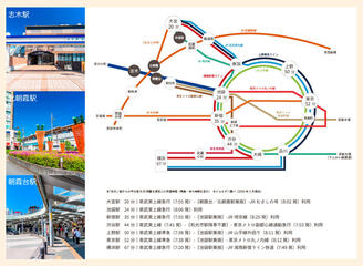 最寄りの北朝霞駅、朝霞台駅、志木駅から都心へスムーズアクセス。車利用で行動範囲も広がる便利な立地。 -