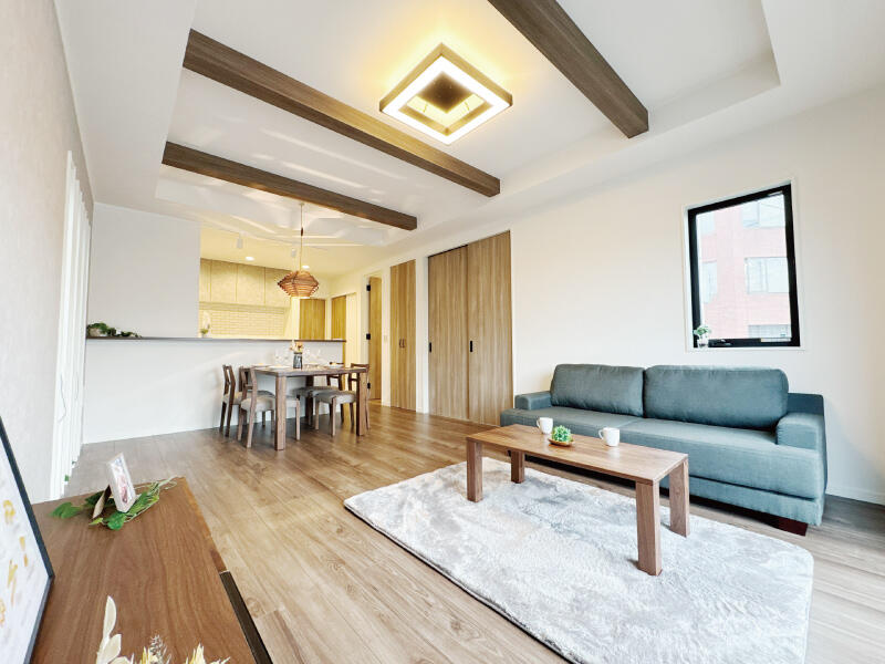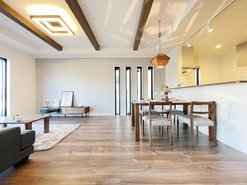 リビングからダイニング・キッチンまでオープンにつながり、開放感のある空間が広がっています。 -