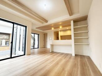 キッチン裏にスタディカウンターがあり、お料理中もお子様の学習を見守れます。リビングの可動棚には雑貨を飾るのもオシャレです!