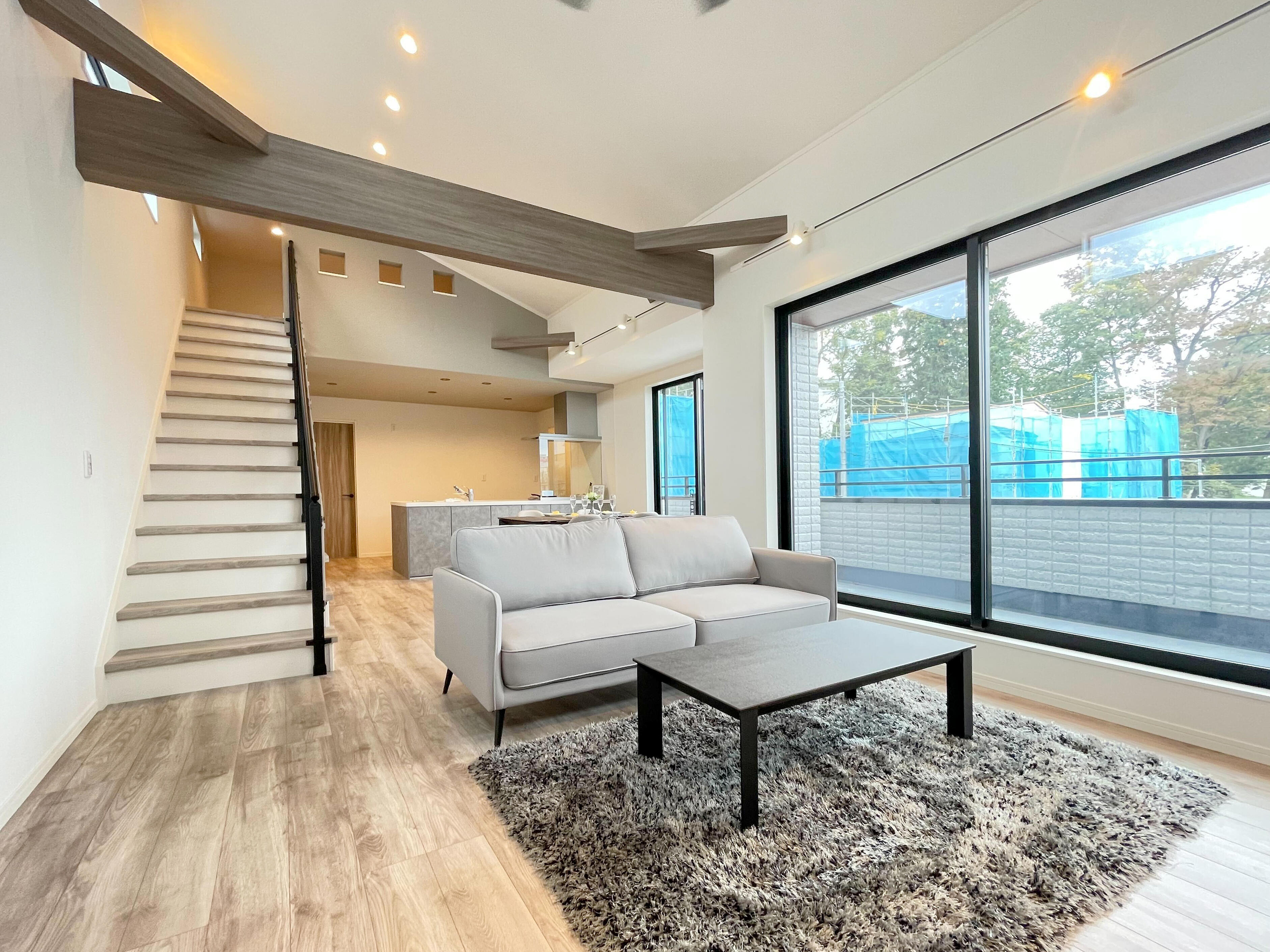 2階リビングの魅力的な勾配天井×ロフトの大空間。
