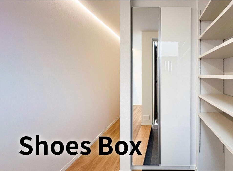 大容量のシューズボックスには靴以外にもDIY用品や外遊び用のおもちゃなども収納できます。また、全身鏡がついているのでお出かけ前の身だしなみチェックにも活躍します。 -