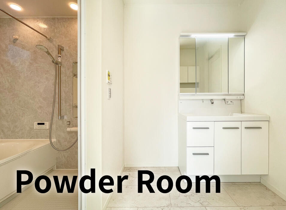 バックガードと洗面ボウルが一体型となった洗面台。左右のカウンターはドライヤーやヘアアイロンなどの仮置きスペースにぴったりです。 -