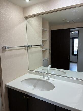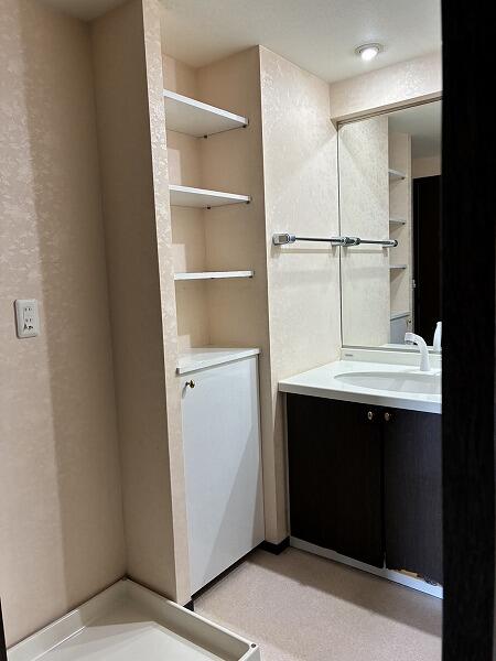 洗面化粧台の隣にはタオル類などがすっきり片付く便利な収納スペース完備です◎ -