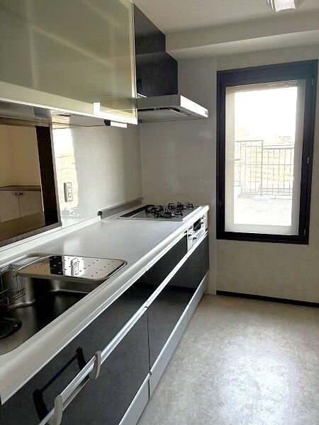 調理中もリビング全体を見渡すことができる対面式のシステムキッチン。収納も多く、食器や調味料、調理器具などすっきり片付きます! -