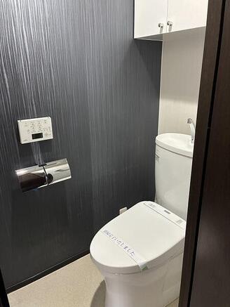 背面に収納が設置され、トイレットペーパーの予備や掃除道具などが片付き、いつでも清潔感のある空間を保てます♪ -