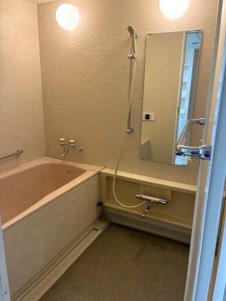 あたたかな色味の浴室は1日の疲れをほぐすくつろぎ空間。水回りが近く、家事動線の良い間取です。 -