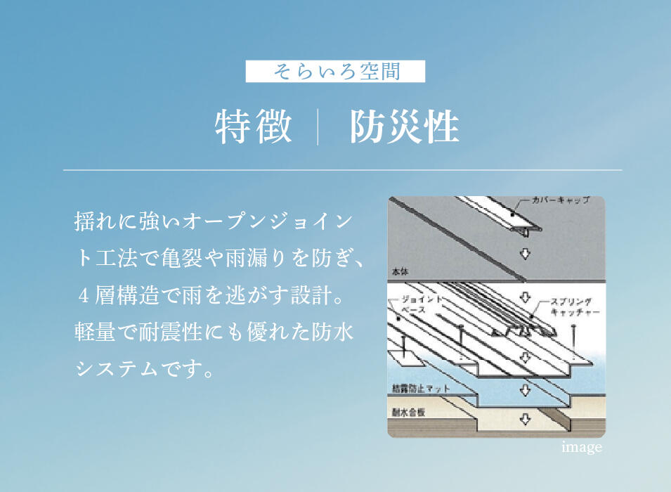 雨水を侵入させないつなぎ目の仕組み「オープンジョイント工法」を用い、揺れることで力を分散させ耐震性を発揮する木造住宅にマッチした施工。 -