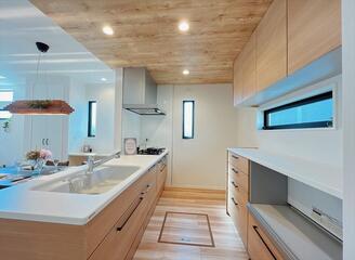 デザイン性と機能性を兼ね備えた、キッチン上部の下がり天井。