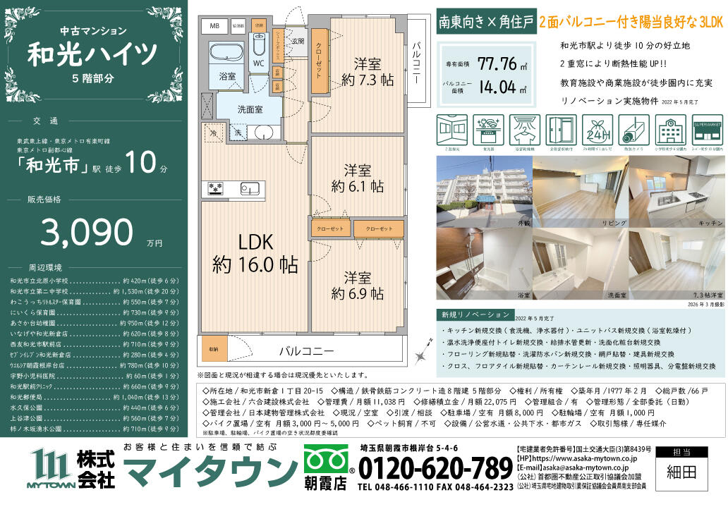 2022年5月リノベーション実施!南東向き角住戸の陽当たりの良い3LDKです。