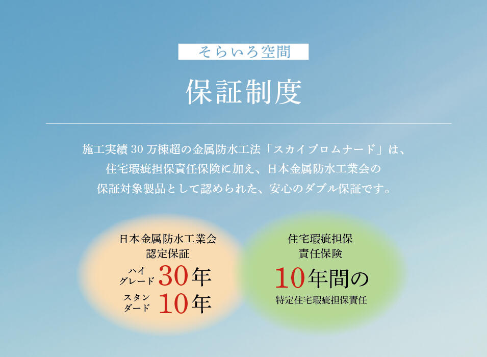 国が定める住宅瑕疵担保責任保険に加え、実績が認められNPO法人日本金属防水工業会の保証対象製品となっており、安心のダブル保証です。