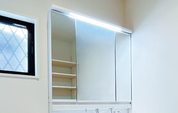 鏡部分を開口するとコップや歯磨きなどの収納棚がございます。